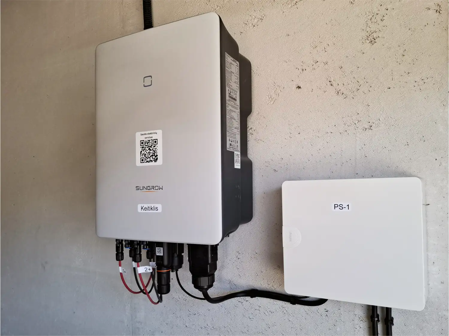 Kartu sumontuotas galios keitiklis „Sungrow SG15RT“, kurio efektyvumas siekia 98,1 %, o platus MPPT įtampos diapazonas leidžia maksimaliai išnaudoti saulės modulių galią.